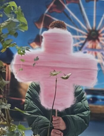 Sur la première, une barbe à papa rose, étrangement en forme de croix, tenue par un enfant dans une kermesse.